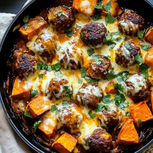 Now it’s time to bring everything together. Add the cooked meatballs and roasted sweet potatoes to the pan with the sauce. Gently stir everything to combine and coat the meatballs and sweet potatoes in the spicy mixture. Once evenly mixed, sprinkle the grated cheese mix (cheddar and mozzarella) over the top. Cover the pan with a lid and reduce the heat to low. Let it cook for 3–4 minutes, just until the cheese melts into a gooey layer and all the flavors have mingled together into one big cheesy, spicy hug.