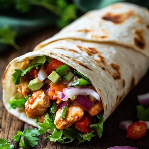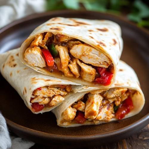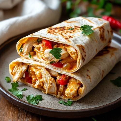 Lay out your tortilla wraps flat on a clean surface. Sprinkle a layer of grated mozzarella cheese (about 1–2 tablespoons) across the center of each wrap. Spoon on a generous amount of the chicken mixture, making sure not to overfill. Then, sprinkle more mozzarella on top of the filling for extra meltiness. Carefully fold the wraps like a burrito fold the sides in first, then roll from the bottom up tightly so nothing falls out.