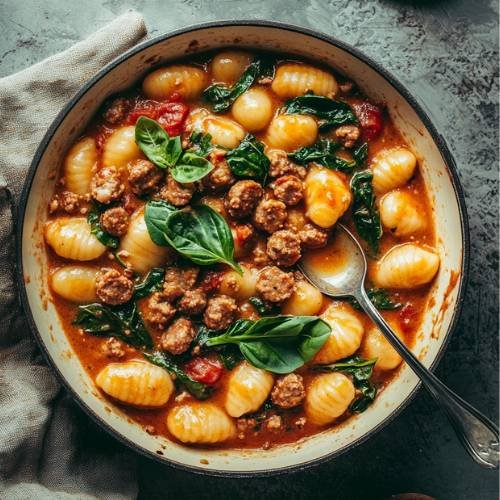 Scoop generous spoonfuls into bowls and serve while hot. If you like a little extra heat or sharpness, sprinkle over some chili flakes or a bit of grated parmesan. Then dig in and enjoy your creamy sausage and tomato gnocchi masterpiece. You earned it!