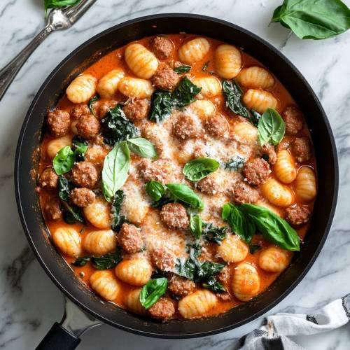 To finish the dish, toss in a generous handful of fresh spinach and add a splash or two of water just enough to loosen the sauce if it’s feeling a bit thick. Stir gently until the spinach wilts and blends into the sauce. This only takes about 1–2 minutes. You’ll end up with a silky, cheesy tomato sauce wrapped around crispy gnocchi and hearty sausage. It’s ready when everything looks glossy, green, and totally irresistible.