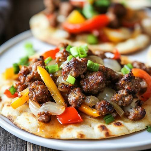 - Prep the Flatbreads – Lay your flatbreads on a baking tray. Spoon the sausage mixture evenly over each, then top with grated mozzarella.