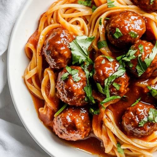 To serve, plate the linguine and meatballs, making sure to drizzle any remaining sauce over the top. For a fresh touch, sprinkle some chopped parsley over the dish to add a burst of color and an extra layer of flavor. The parsley will complement the sweet and smoky flavors of the meatballs perfectly.