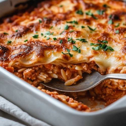 If you love lasagne and orzo as much as I do, then this Lasagne Orzo recipe is about to become your new favorite meal! It’s a hearty, comforting dish that combines the best of both worlds tender orzo pasta with a rich, savory beef mixture and topped with a crispy, golden cheese layer. It’s perfect for any day of the week, and trust me, you won’t be able to stop at just one plate. This dish serves 4-5, so there’s plenty to go around for family dinners or even leftovers the next day. Let’s dive into how to make this cheesy, mouth-watering creation!