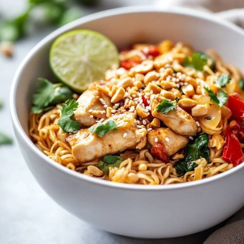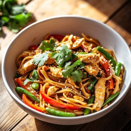 Once the noodles, chicken, and sauce are well-mixed and heated through, transfer the dish onto plates. Garnish with freshly chopped cilantro and a sprinkle of crushed peanuts for added crunch and flavor. Serve immediately while it’s hot, and enjoy the creamy, savory goodness!