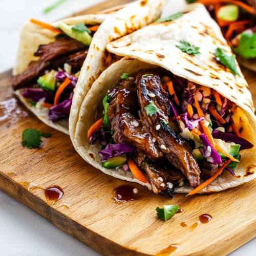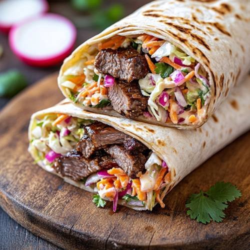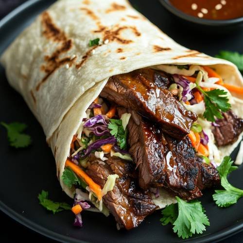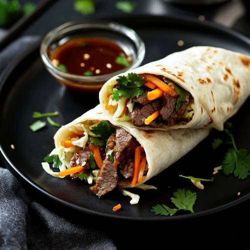 After wrapping them up, you can optionally garnish with fresh coriander for a burst of freshness and extra flavor. Serve your Teriyaki Beef Wraps with steamed rice on the side or a simple salad to balance out the flavors. For an extra kick, drizzle some sriracha sauce over the top or add a few slices of creamy avocado inside the wrap. Enjoy your flavorful, savory meal!